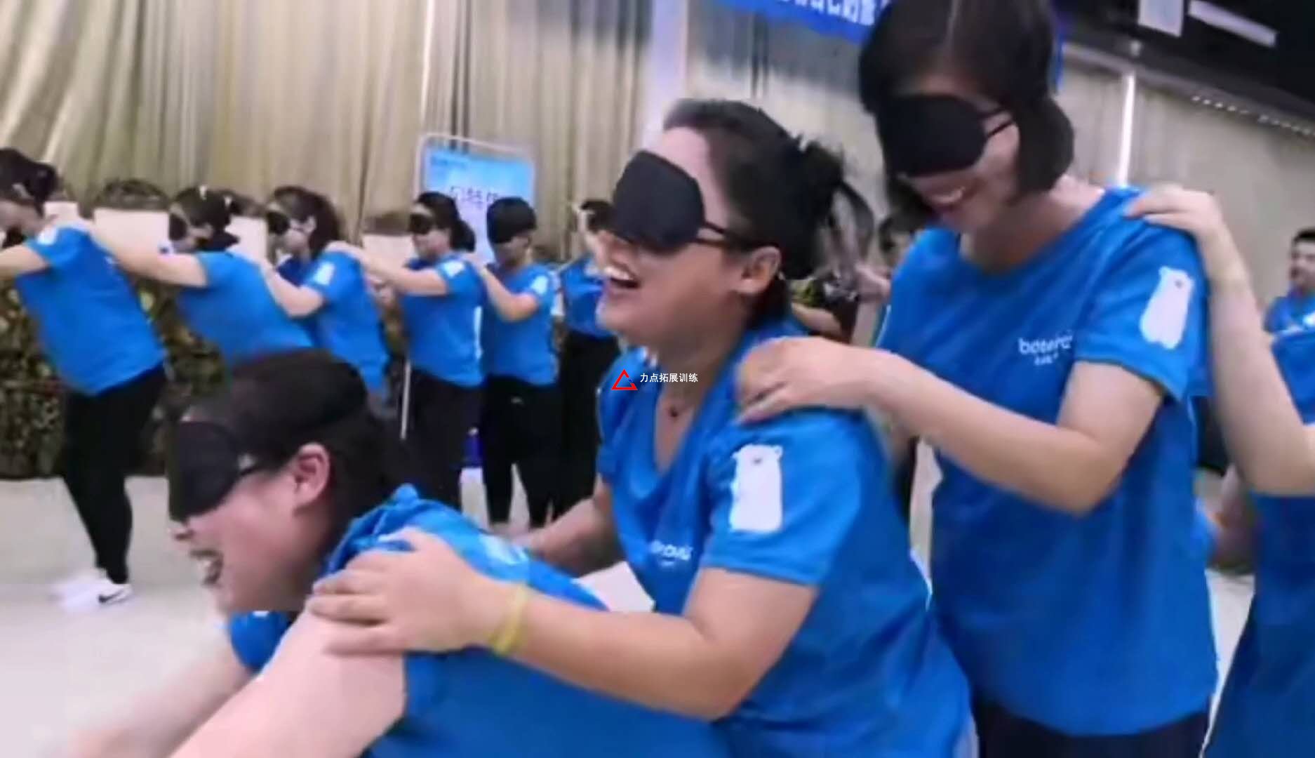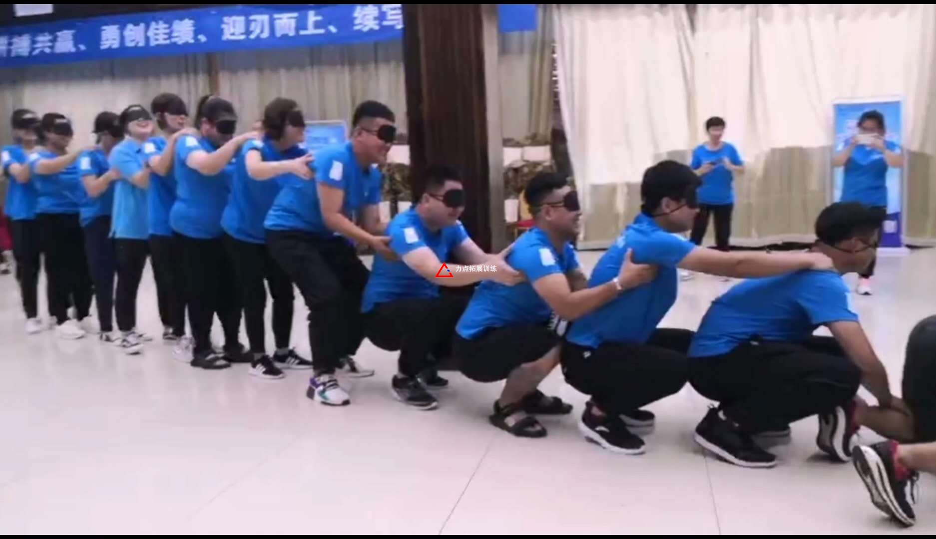比賽規(guī)則: 1、小組所有人不可以說話; 2、所有人隊員站成一列,后面隊員雙手搭在前面隊員肩膀上; 3、除了最后一名隊員外其他隊員都戴上眼罩; 4、通過最后一名隊員指揮團隊...