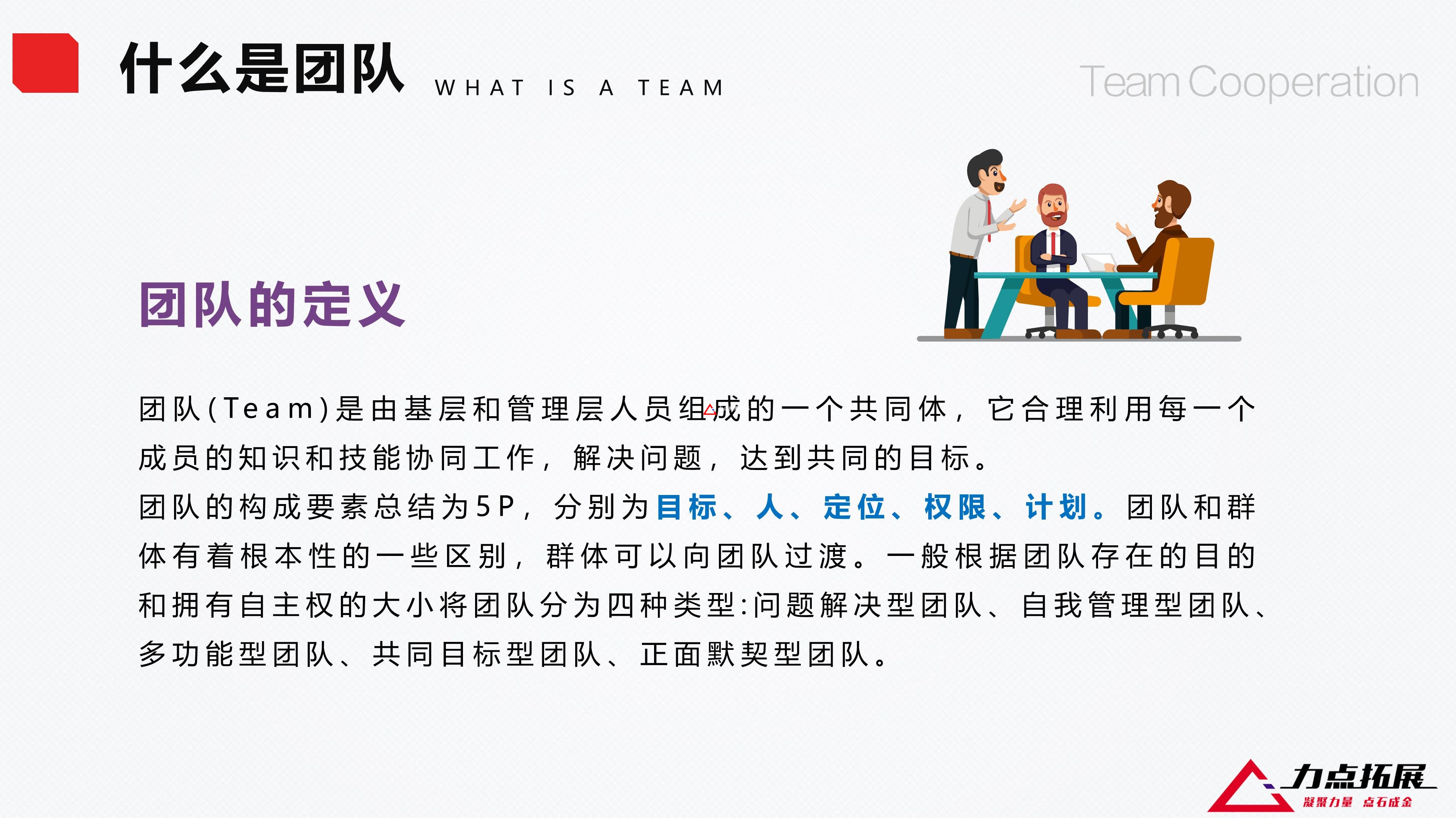 團(tuán)隊(duì)的構(gòu)成要素總結(jié)為5P,分別為目標(biāo)、人、定位、權(quán)限、計(jì)劃。團(tuán)隊(duì)和群體有著根本性的一些區(qū)別,群體可以向團(tuán)隊(duì)過(guò)渡。一般根據(jù)團(tuán)隊(duì)存在的目的和擁有自主權(quán)的大小將團(tuán)隊(duì)分為四種類型:問(wèn)題解決型團(tuán)隊(duì)、自我管理型團(tuán)隊(duì)、多功能型團(tuán)隊(duì)、共同目標(biāo)型團(tuán)隊(duì)、正面默契型團(tuán)隊(duì)。