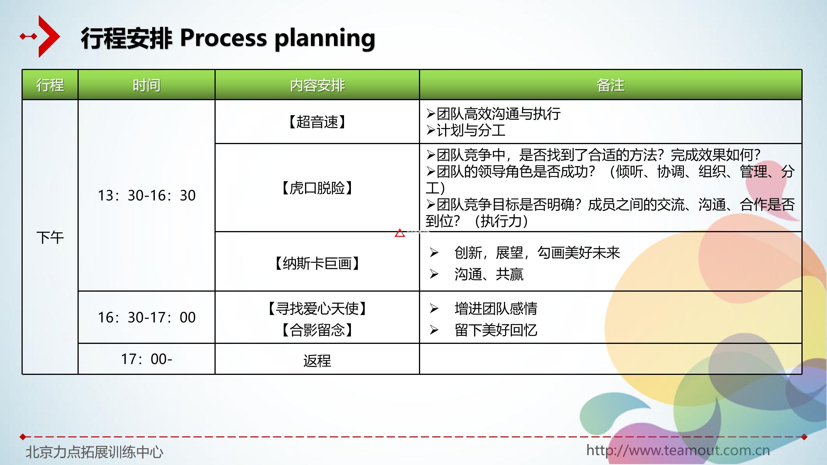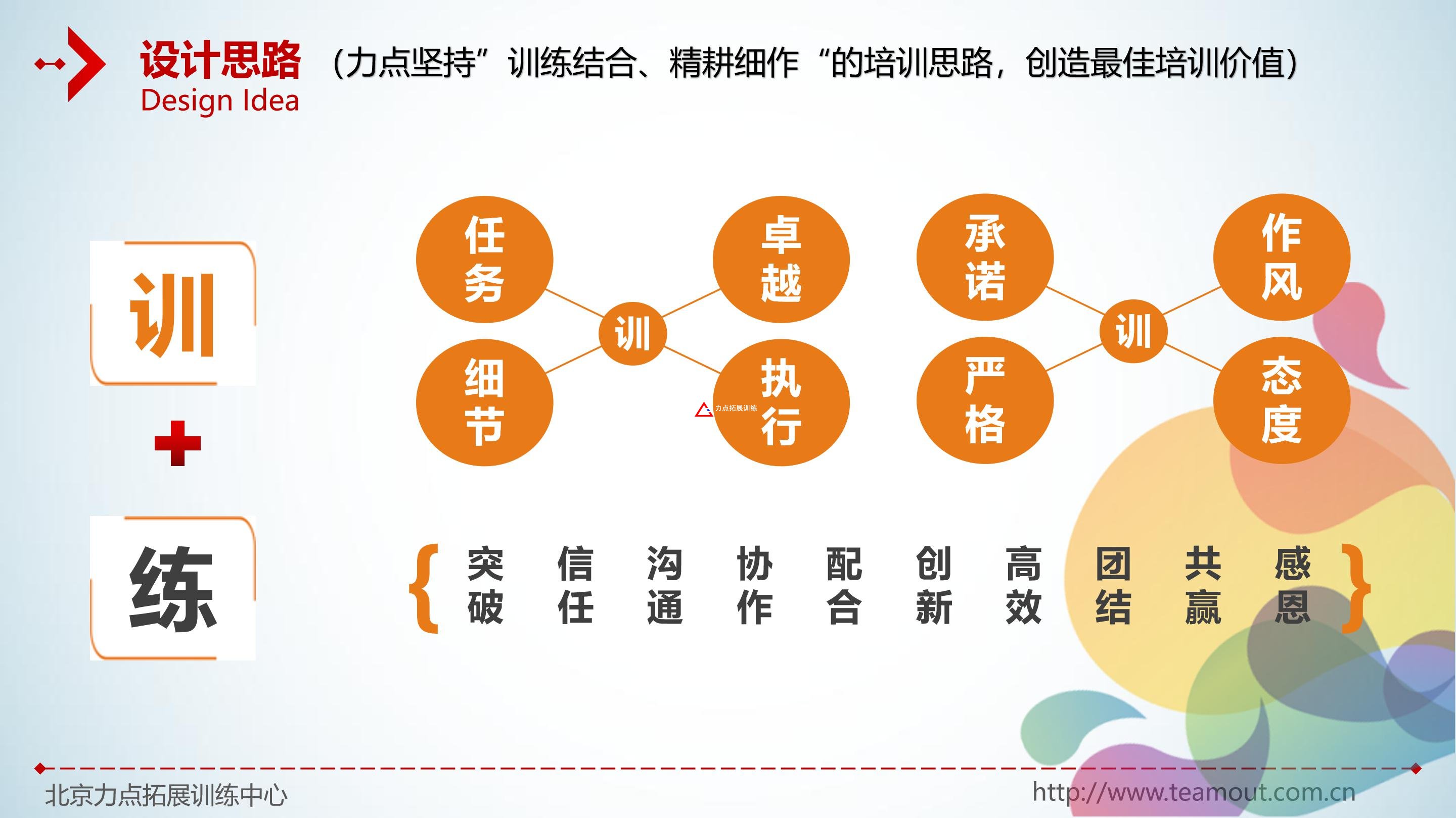 態(tài)度決定一切。團(tuán)隊(duì)內(nèi)出現(xiàn)的大部分問(wèn)題都與“態(tài)度”有關(guān),因此,力點(diǎn)拓展培訓(xùn)的重點(diǎn)在于改變?nèi)说膽B(tài)度,諸如:合作、溝通、理解和信任等。